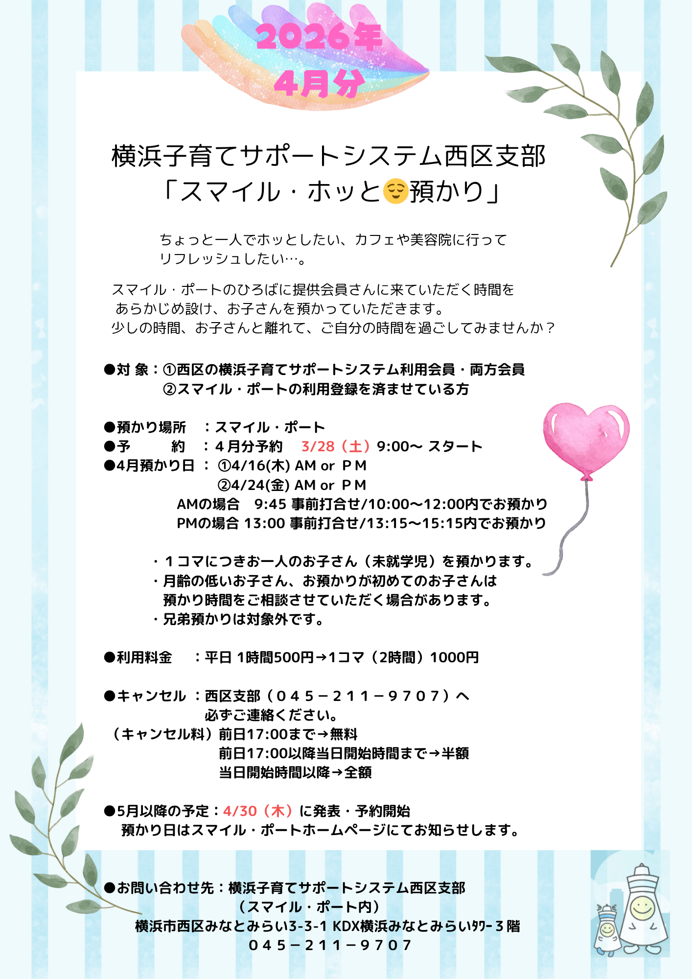 (西区地域子育て支援拠点「スマイル・ポート内」)TEL : 045-211-9707(火曜~土曜 9:00~17:00)