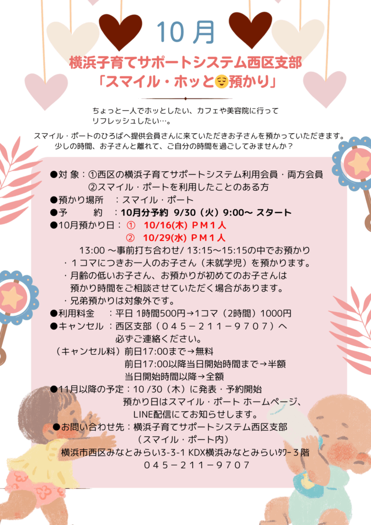「スマイル・ホッと預かり」(子サポ会員対象) 10月分予約を開始しました。