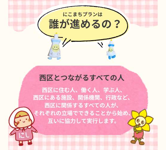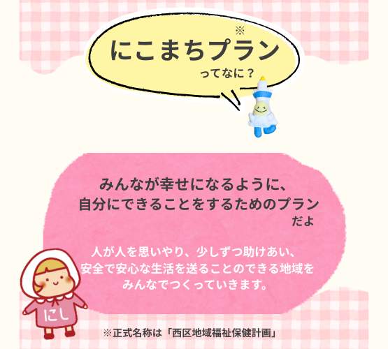 「誰もがにこやかしあわせにくらすまち」を目指す「西区地域福祉保健課計画(第5期にこまちプラン)」の素案がまとまり公開されました。西区では、素案に対する区民や西区につながる皆さんからの意見を11月10日(月)まで募集しています。