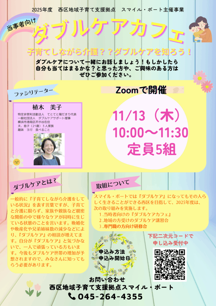 【要予約】ダブルケアカフェ オンライン 11/13(木)10:00~11:30 ダブルケアについて一緒にお話しましょう!自分もそうかな?今後そうなるかもと思った方、ご興味のある方はぜひご参加ください。今回は家からZoomで参加ができます。初めての方も気軽にどうぞ!