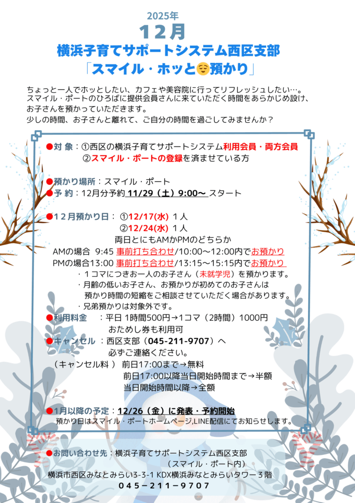 「スマイル・ホッと預かり」(子サポ会員対象) 12月分予約を開始しました。