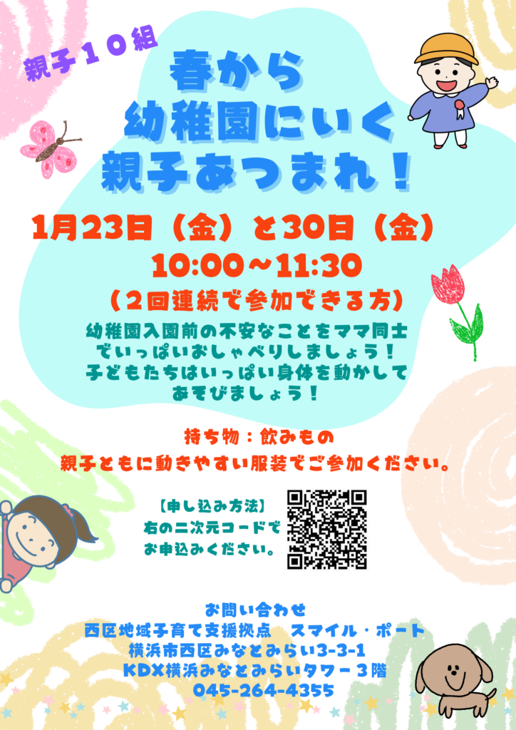 【要予約】連続講座 春から幼稚園にいく親子あつまれ!                              1/23(金)1/30(金)10:00~11:30 幼稚園前の不安なことをパパママ同士でおしゃべりしましょう!子どもたちはいっぱい身体を動かしてあそぼう!2回とも参加できる親子。