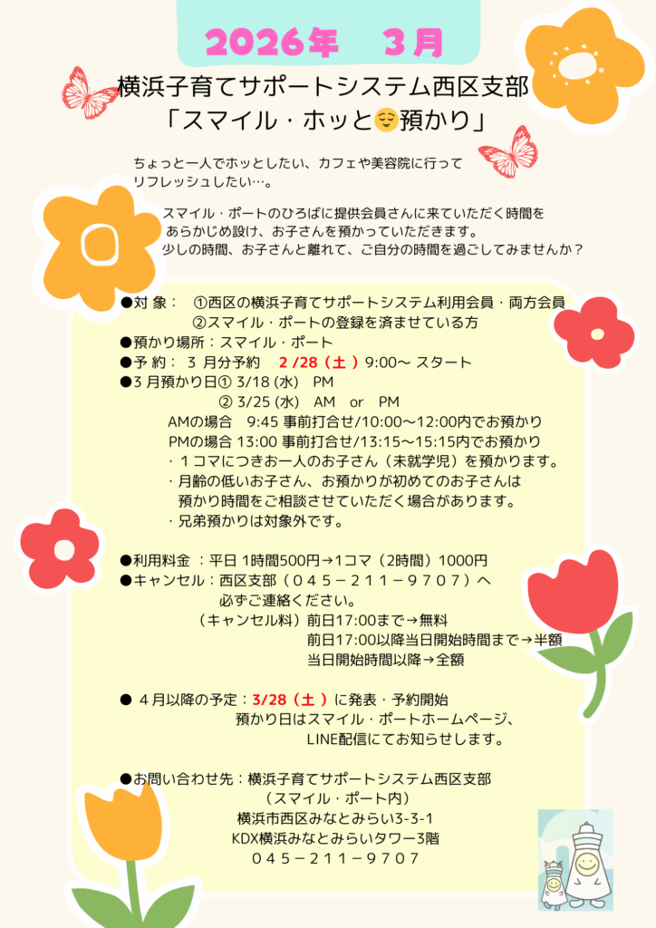 「スマイル・ホッと預かり」(子サポ会員対象) 3月分予約を開始しました。
