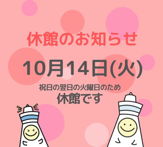 10月14日(火)は祝日(スポーツの日)の翌火曜日のためお休みです。