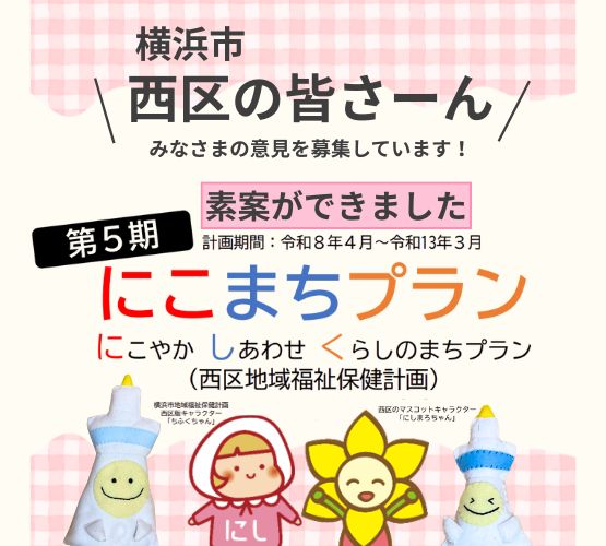 素案は下記の意見箱設置の場所か【横浜市西区 第5期にこまちプラン】のページで見られます。ぜひ意見をお寄せください。