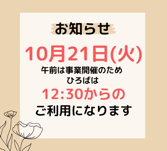 10月21日(火)は事業開催のためひろばは12:30からの利用になります。