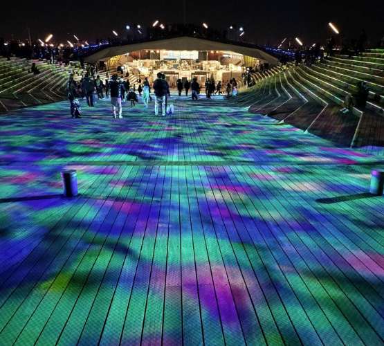 大さん橋会場は、屋上全体が演出エリアとなる「クジランド」に。今年も国内最大級のプロジェクションマッピングが出現し、25mの光のくじらが泳ぎます。お子さんたちが光を追いかける姿もあり没入体験できるエリアです。