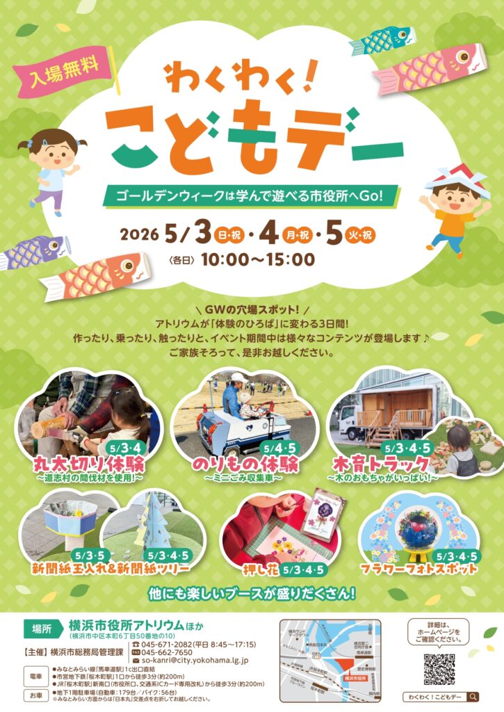 5月3日(日曜日・祝日)から5日(火曜日・祝日)までの3日間、横浜市役所で「わくわく!こどもデー GWは学んで遊べる市役所へGO!」を開催します。